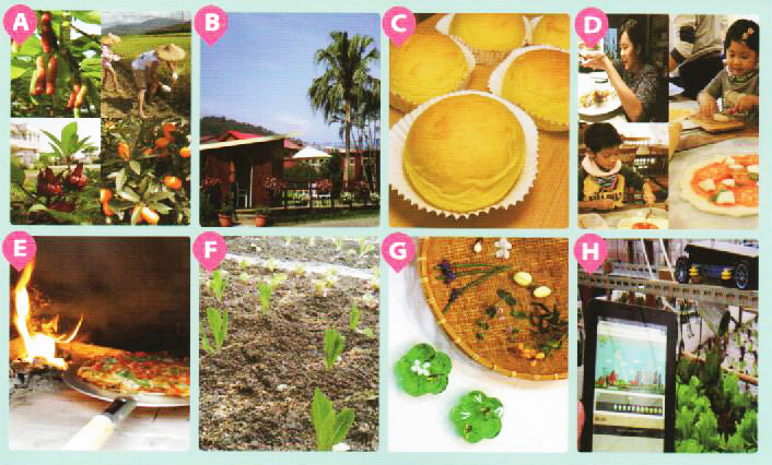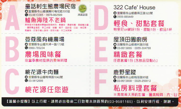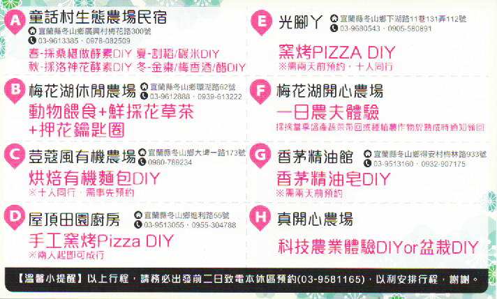 | A.童話村生態農場民宿 春/採桑椹作酵素DIY 夏/割稻、碾米DIY 秋/採洛神花酵素DIY 冬/金棗、梅香酒/醋DIY |